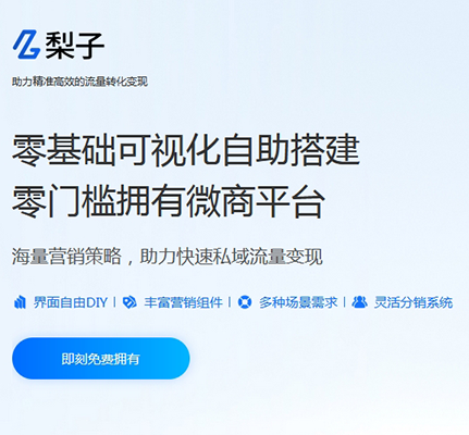 【梨子商城】提供免費(fèi)專業(yè)的微商城系統(tǒng), 支持商家自助免費(fèi)開通專屬私域營(yíng)銷、分銷平臺(tái)商城。